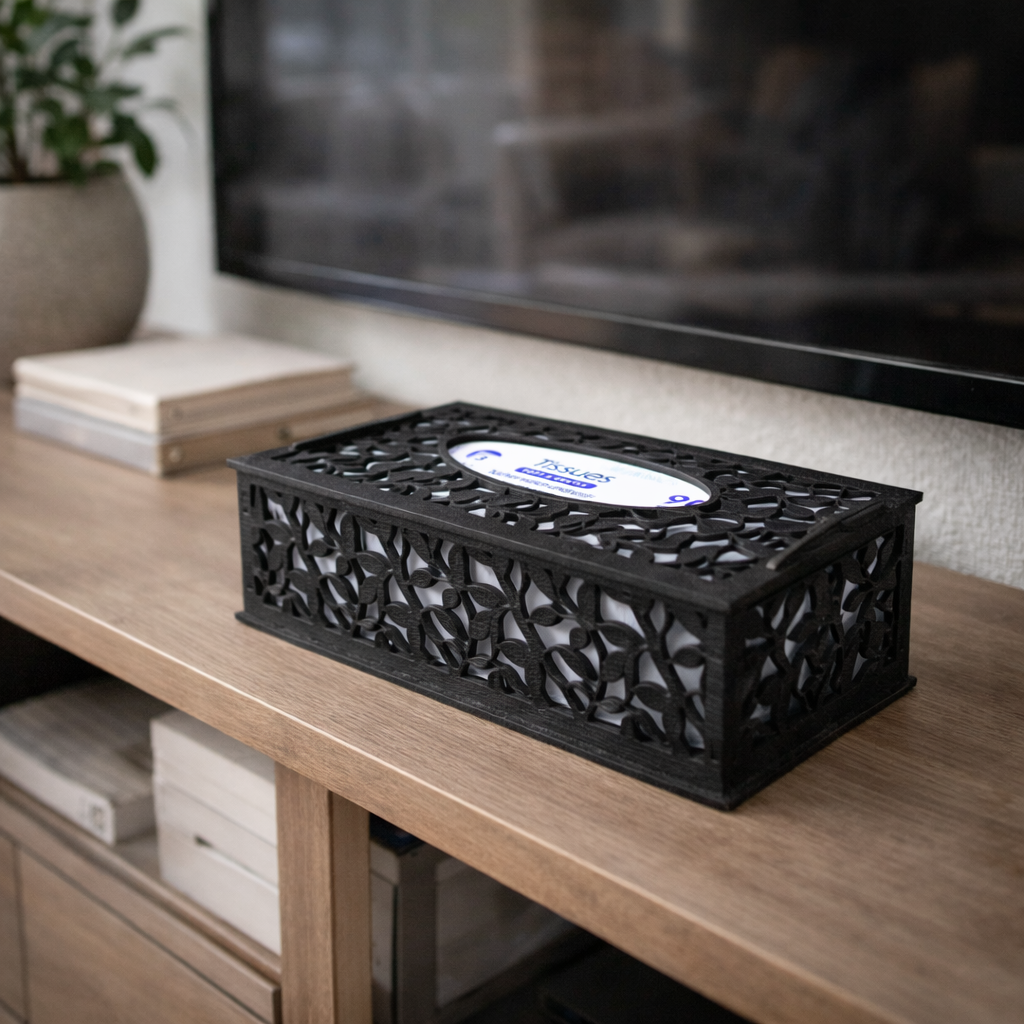 Transformez vos boîtes à mouchoirs en un accessoire déco élégant avec cette boîte ajourée au motif feuilles, peinte et vernie en noir pour une finition soignée.